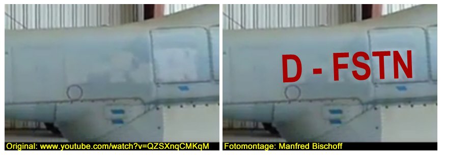 (FAA). ![]() Anm.: Im Video sind am Rumpf keine entsprechenden Merkmale zu finden. Ein Vergleich zeigt die übermalte und die ehemalige Registrierung D-FSTN: ![]()