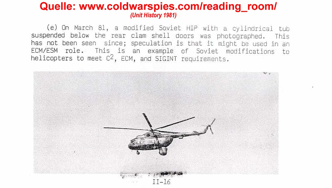 Ein mysteriöser Hubschrauber vom Typ MI-8R (R = Razvedchik = Разведчик = Aufklärer) bzw. MI-8GR (GR = Grebeshok = Kamm-/Jakosmuschel) war in mindestens zwei Exemplaren bei der WGT im Einsatz. In anderen Quellen wird er auch als MI-8K oder MI-8KZA (Kontrolxnaya Zapasnaya Apparatura = Контрольная Запасная Аппаратура = Kontroll-Ersatz-(Reserve-)Apparatur) bezeichnet. Eine erste Sichtung dieses Hubschraubers in der DDR erfolgte 1981 durch die Militärverbindungsmission der Vereinigten Staaten von Amerika (USMLM).