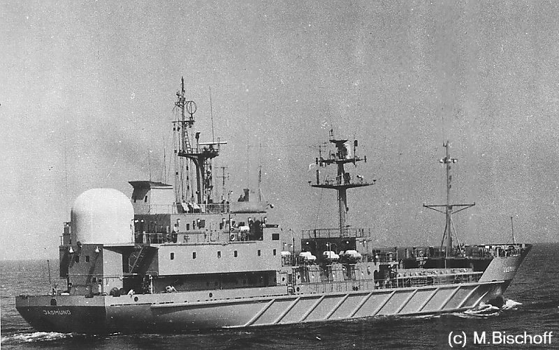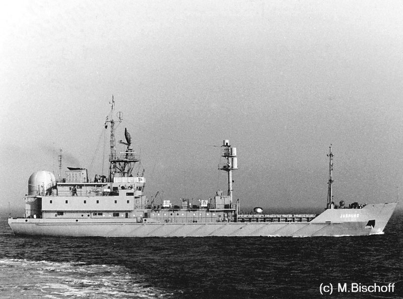 LINK (Seiten 26-28). Die JASMUND wurde am 03.10.1990 außer Dienst gestellt und im November 1992 nach Spanien verkauft, wo sie in Puerto de la Luz auf den Kanarischen Inseln umgebaut wurde. Die große Antenne und das Radom wurden demontiert und eine SATURN 3S Satelliten- Kommunikationsanlage installiert. 1993 wurde sie als ALERTA (Kennung A 111) in Dienst gestellt und löste das Patrouillenschiff ALSEDO als AGI (Auxiliary General Intelligence collector ship) ab. Heimathafen ist Cartagena. |