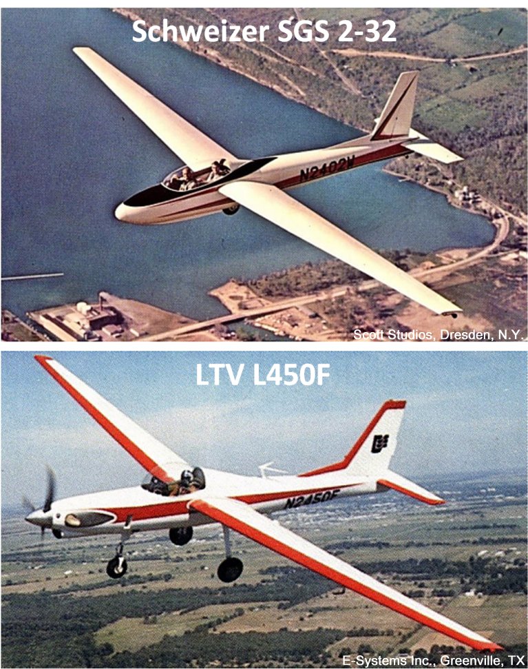 unbemannter Konfiguration fliegen soll. Es wird als L450F bezeichnet (![]() Die L450F wurde aus einem Schweizer SGS 2-32 Segelflugzeug entwickelt und von Schweizer nach den Spezifikationen von LTV modifiziert. |